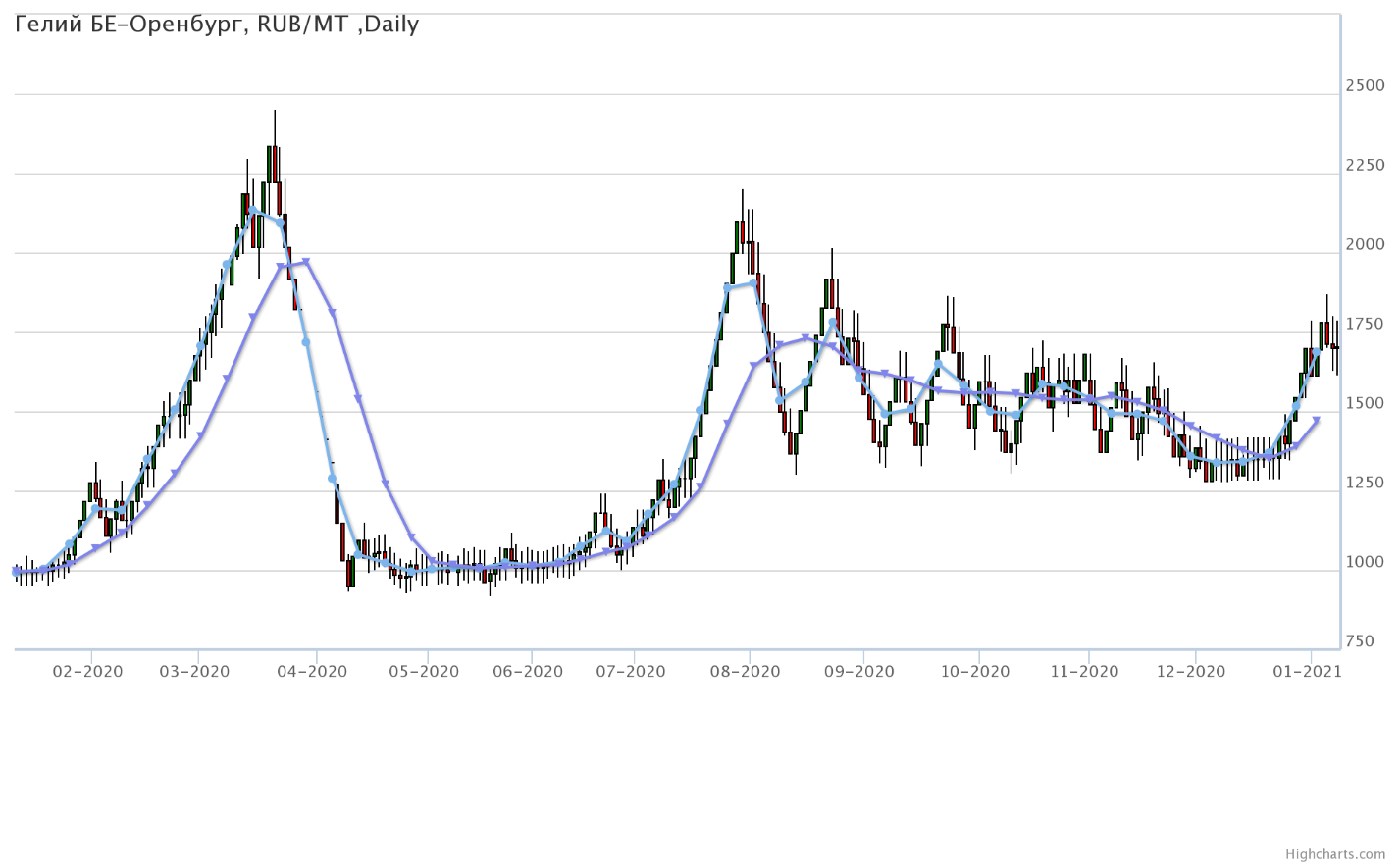 Цены на гелий газообразный, базис поставки Оренбургская область, выросли за неделю на 6 рублей до 1706 рублей за кубический метр.