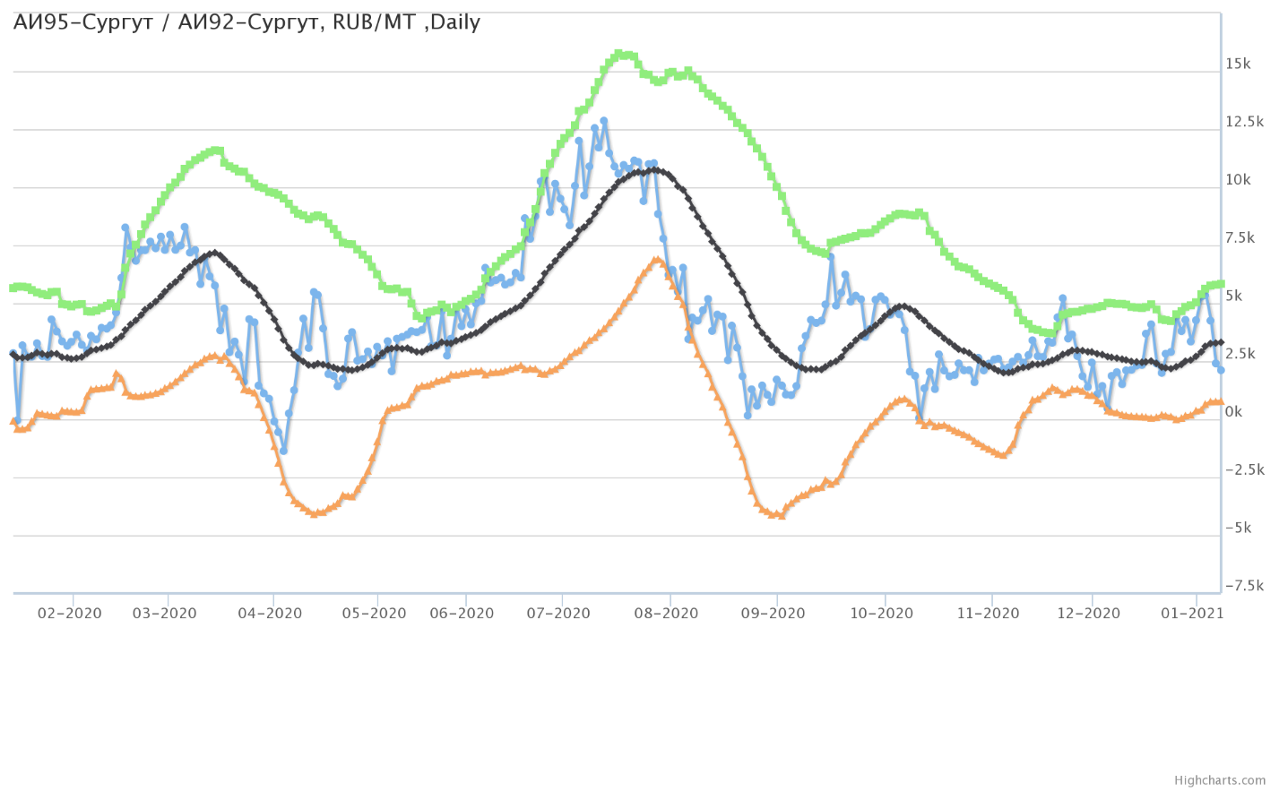 Разница цен между 95-м и 92-м бензином на базисе Сургут (Ханты-Мансийский а.о.).