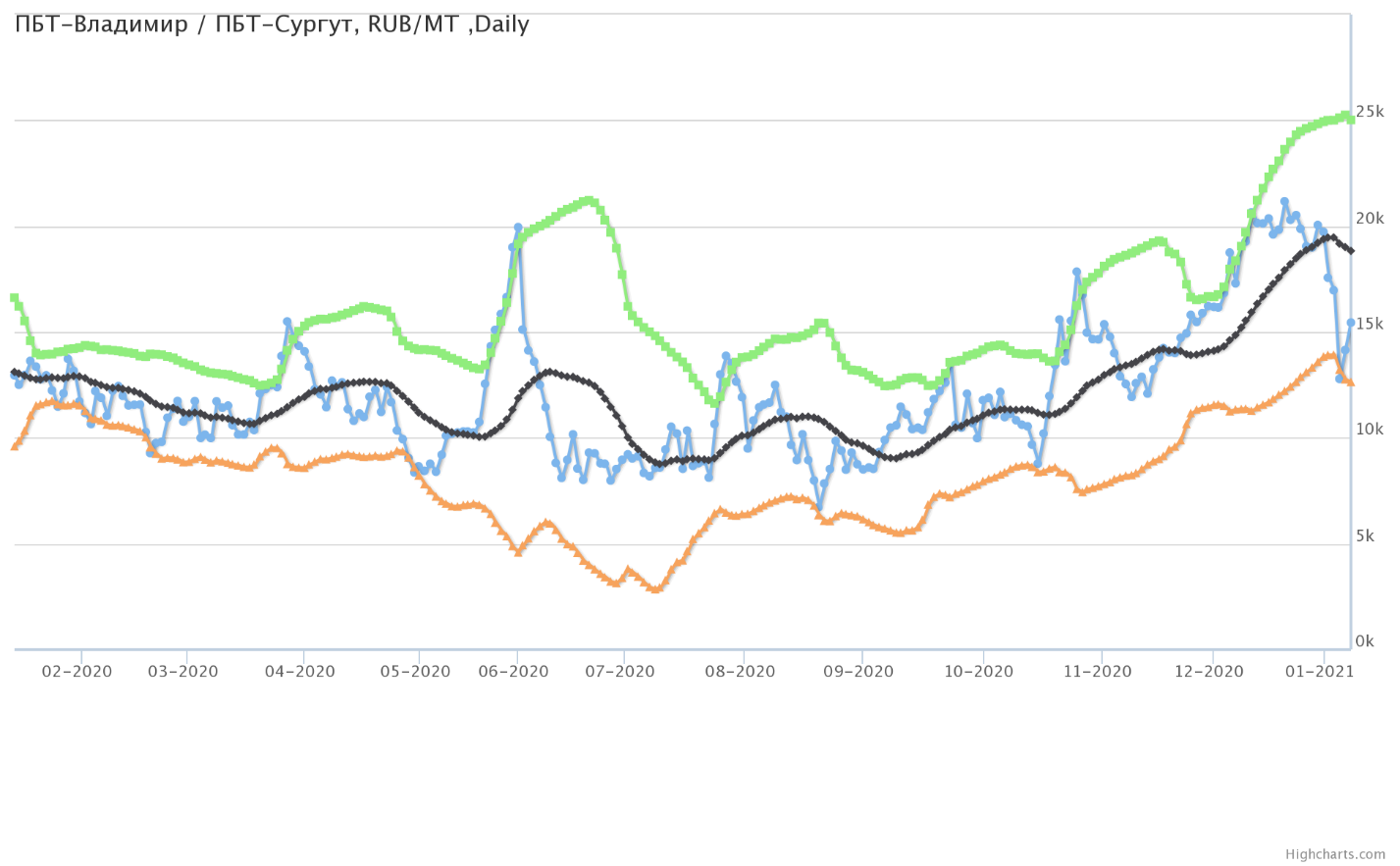 Разница цен между ПБТ на базисе Владимир и ПБТ на базисе Сургут (Ханты-Мансийский а.о.).