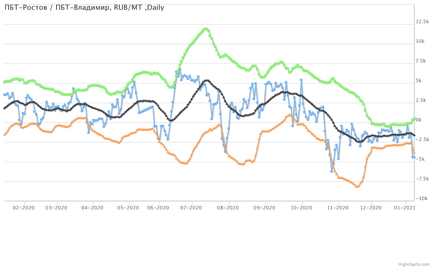 Разница цен между ПБТ на базисе Ростов и ПБТ на базисе Владимир.