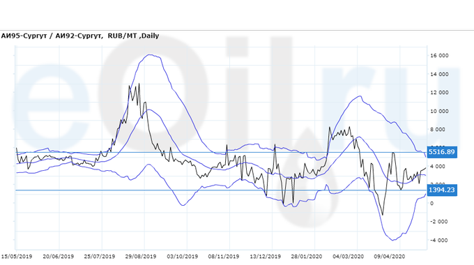Разница цен между 95-м и 92-м бензином на базисе Сургут (Ханты-Мансийский а.о.).