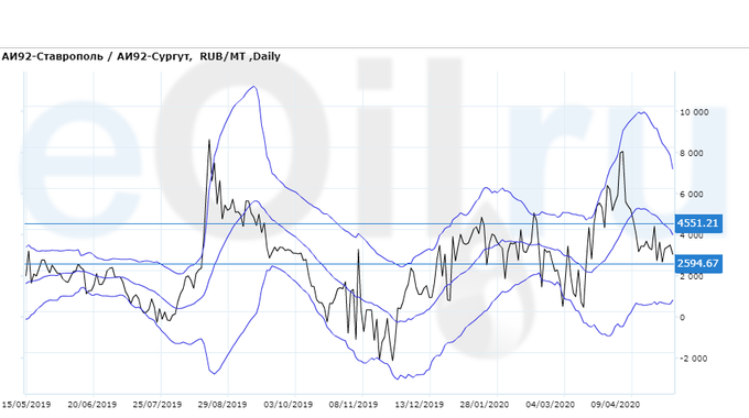 Разница цен между 92-м бензином на базисе Ставрополь и 92-м бензином на базисе Сургут (Ханты-Мансийский а.о.).