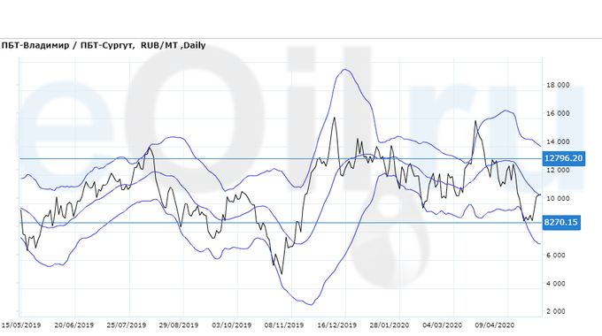 Разница цен между ПБТ на базисе Владимир и ПБТ на базисе Сургут (Ханты-Мансийский а.о.).