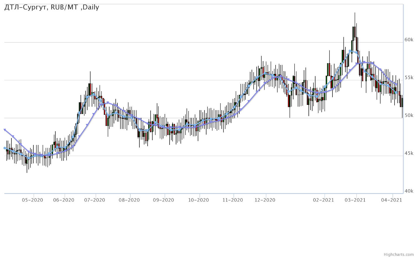 Цены на топливо дизельное ДТ-А-К5, базис поставки Ханты-Мансийский АО, снизились за неделю на 1346 рублей до 51254 рублей за тонну.