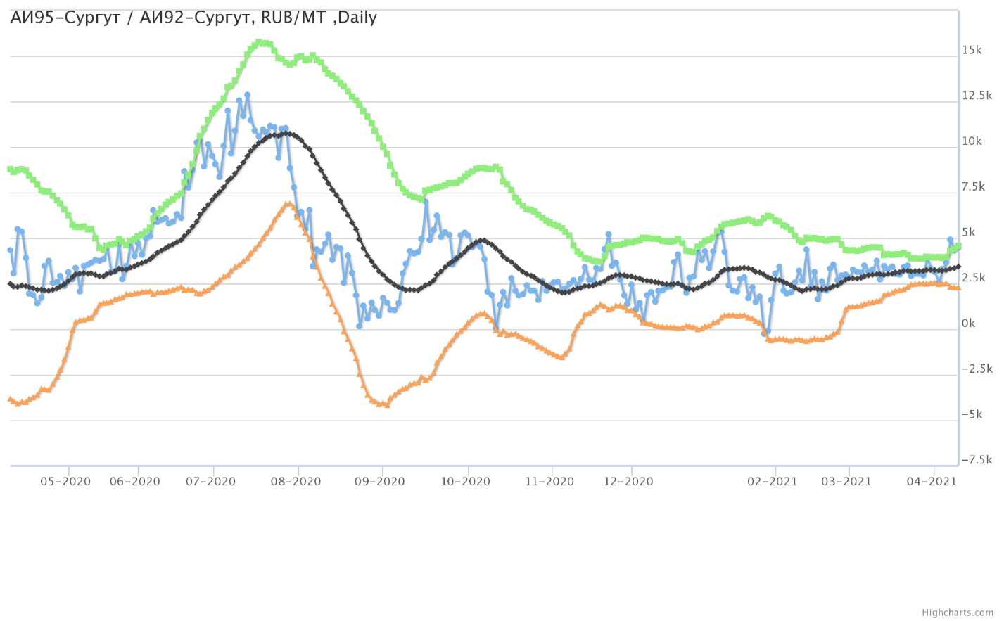 Разница цен между 95-м и 92-м бензином на базисе Сургут (Ханты-Мансийский а.о.).