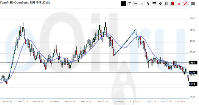 Цены на гелий газообразный, базис поставки Оренбургская область, снизились за неделю на 402 рубля до 2295 рублей за кубический метр.