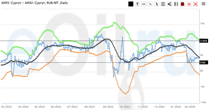 Разница цен между 95-м и 92-м бензином на базисе Сургут (Ханты-Мансийский а.о.).