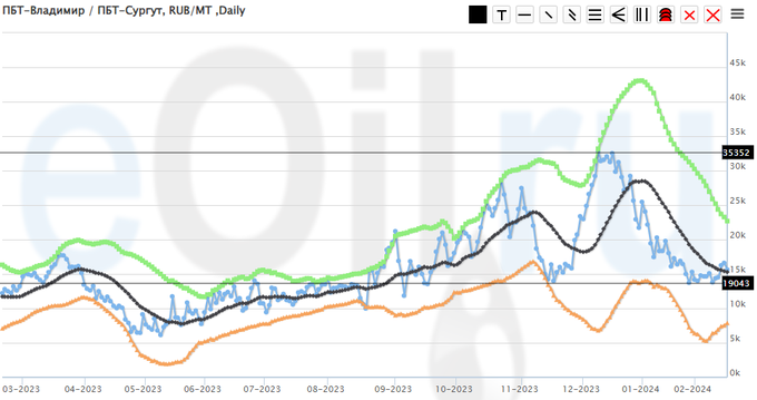 Разница цен между ПБТ на базисе Владимир и ПБТ на базисе Сургут (Ханты-Мансийский а.о.).