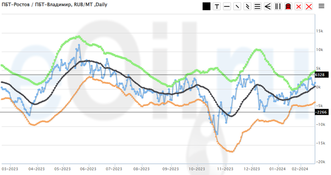 Разница цен между ПБТ на базисе Ростов и ПБТ на базисе Владимир.