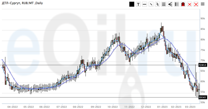 Цены на топливо дизельное ДТ-А-К5, базис поставки Ханты-Мансийский АО, снизились за неделю на 2452 рубля до 56555 рублей за тонну.