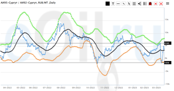 Разница цен между 95-м и 92-м бензином на базисе Сургут (Ханты-Мансийский а.о.).