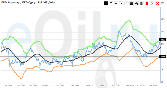 Разница цен между ПБТ на базисе Владимир и ПБТ на базисе Сургут (Ханты-Мансийский а.о.).