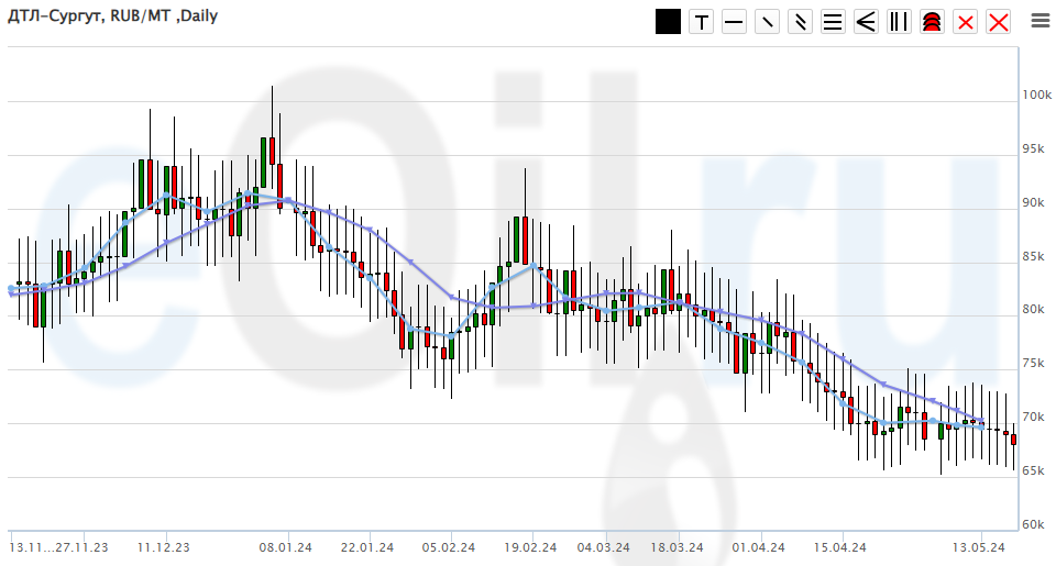 Цены на топливо дизельное ДТ-А-К5, базис поставки Ханты-Мансийский АО, снизились за неделю на 2012 рубля до 68063 рублей за тонну.