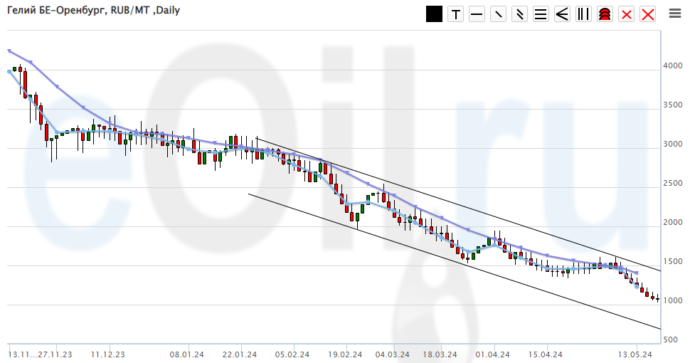 Цены на гелий газообразный, базис поставки Оренбургская область, снизились за неделю на 206 рублей до 1075 рублей за кубический метр.