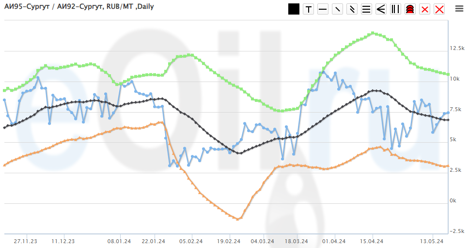 Разница цен между 95-м и 92-м бензином на базисе Сургут (Ханты-Мансийский а.о.).