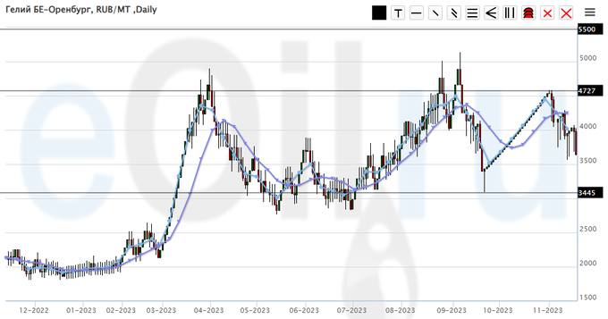Цены на гелий газообразный, базис поставки Оренбургская область, не изменились за неделю, и составляют 4229 рублей за кубический метр.
