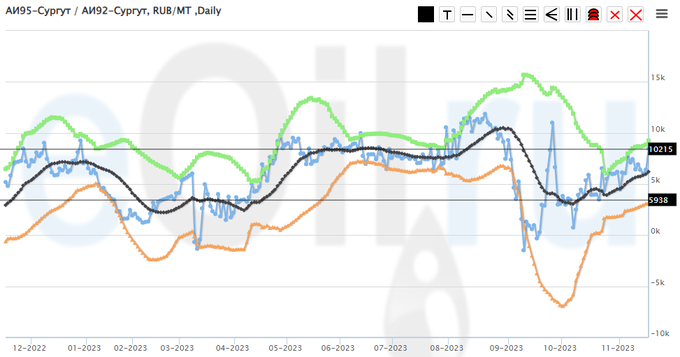 Разница цен между 95-м и 92-м бензином на базисе Сургут (Ханты-Мансийский а.о.).