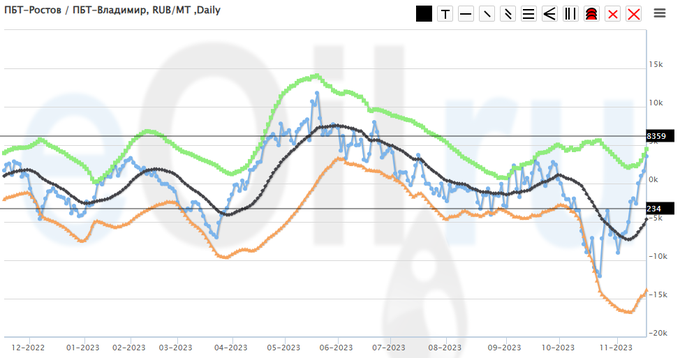 Разница цен между ПБТ на базисе Ростов и ПБТ на базисе Владимир.