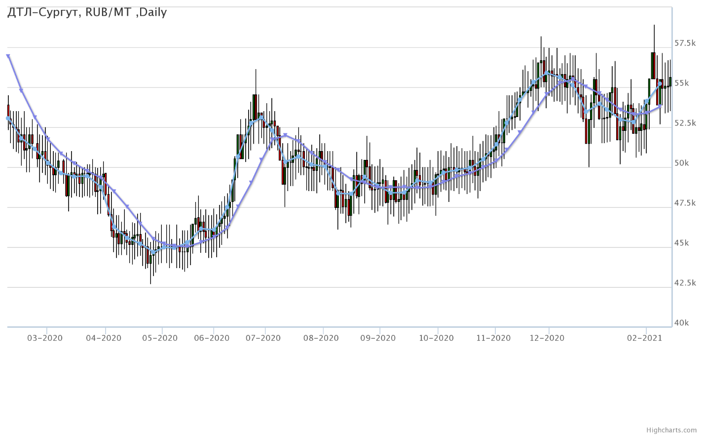 Цены на топливо дизельное ДТ-А-К5, базис поставки Ханты-Мансийский а.о., выросли за неделю на 2885 рублей до 58500 рублей за тонну.