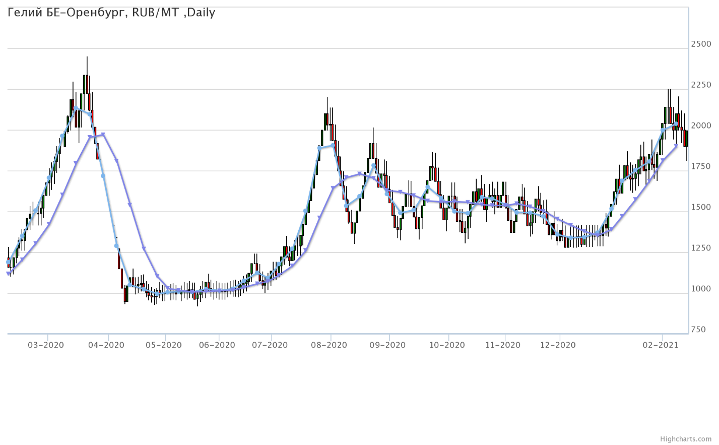 Цены на гелий газообразный, базис поставки Оренбургская область, упали за неделю на 72 рубля до 1925 рублей за кубический метр.