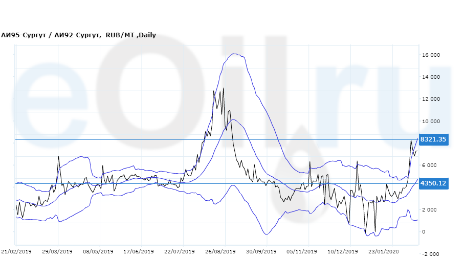 Разница цен между 95-м и 92-м бензином на базисе Сургут (Ханты-Мансийский а.о.).