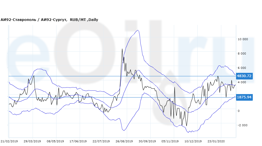 Разница цен между 92-м бензином на базисе Ставрополь и 92-м бензином на базисе Сургут (Ханты-Мансийский а.о.).