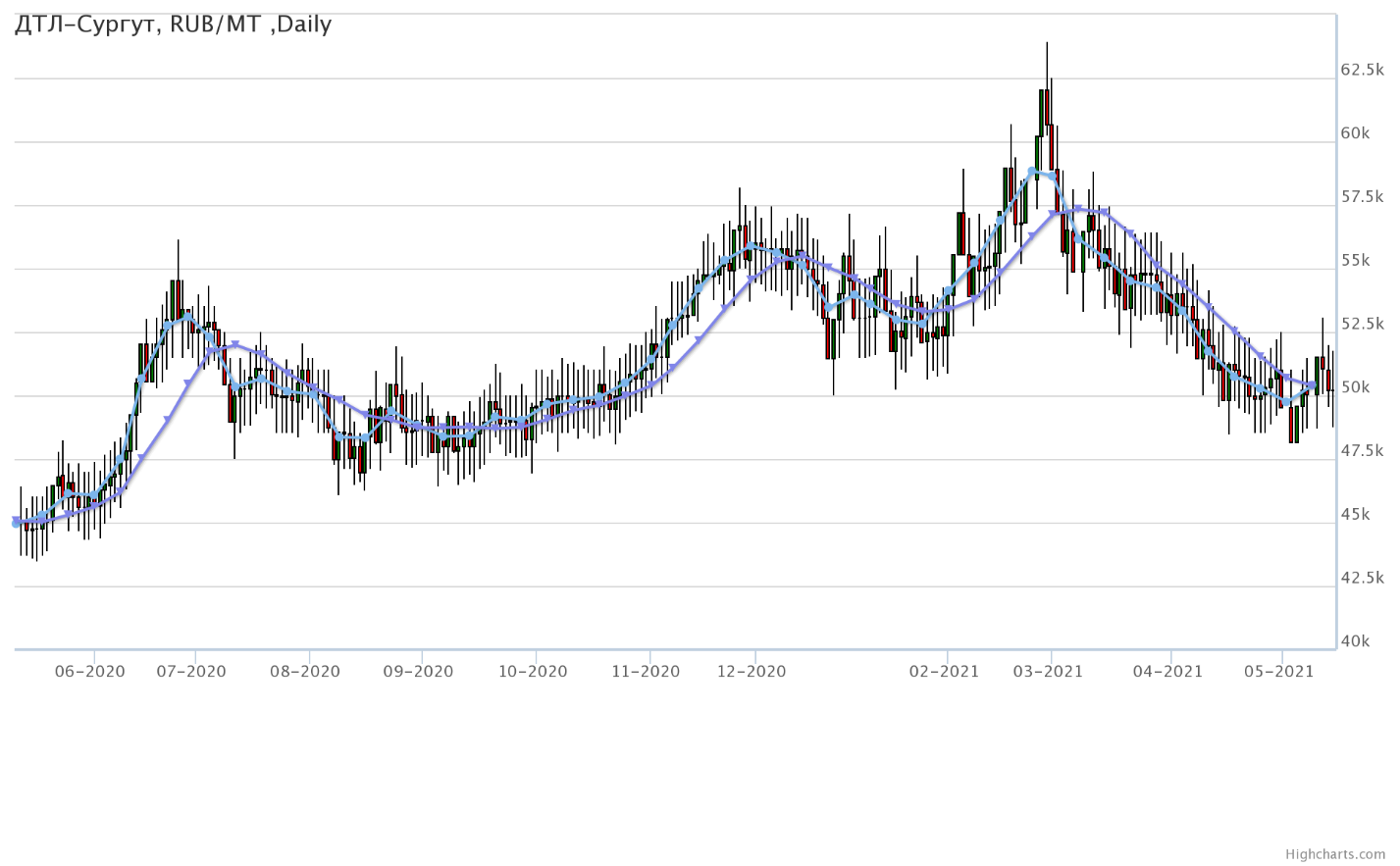 Цены на топливо дизельное ДТ-А-К5, базис поставки Ханты-Мансийский АО, выросли за неделю на 1384 рубля до 51593 рублей за тонну.