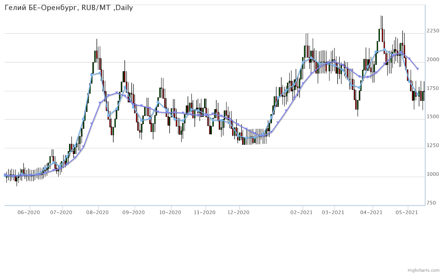 Цены на гелий газообразный, базис поставки Оренбургская область, снизились за неделю на 64 рубля до 1686 рублей за кубический метр.