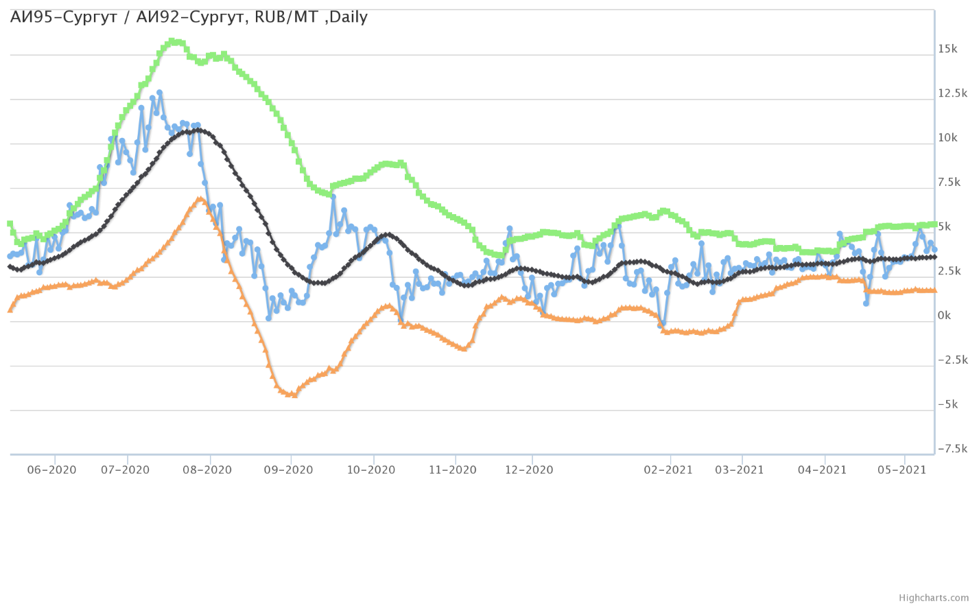 Разница цен между 95-м и 92-м бензином на базисе Сургут (Ханты-Мансийский а.о.).