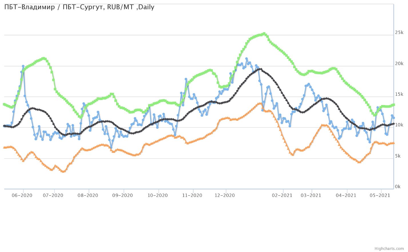 Разница цен между ПБТ на базисе Владимир и ПБТ на базисе Сургут (Ханты-Мансийский а.о.).
