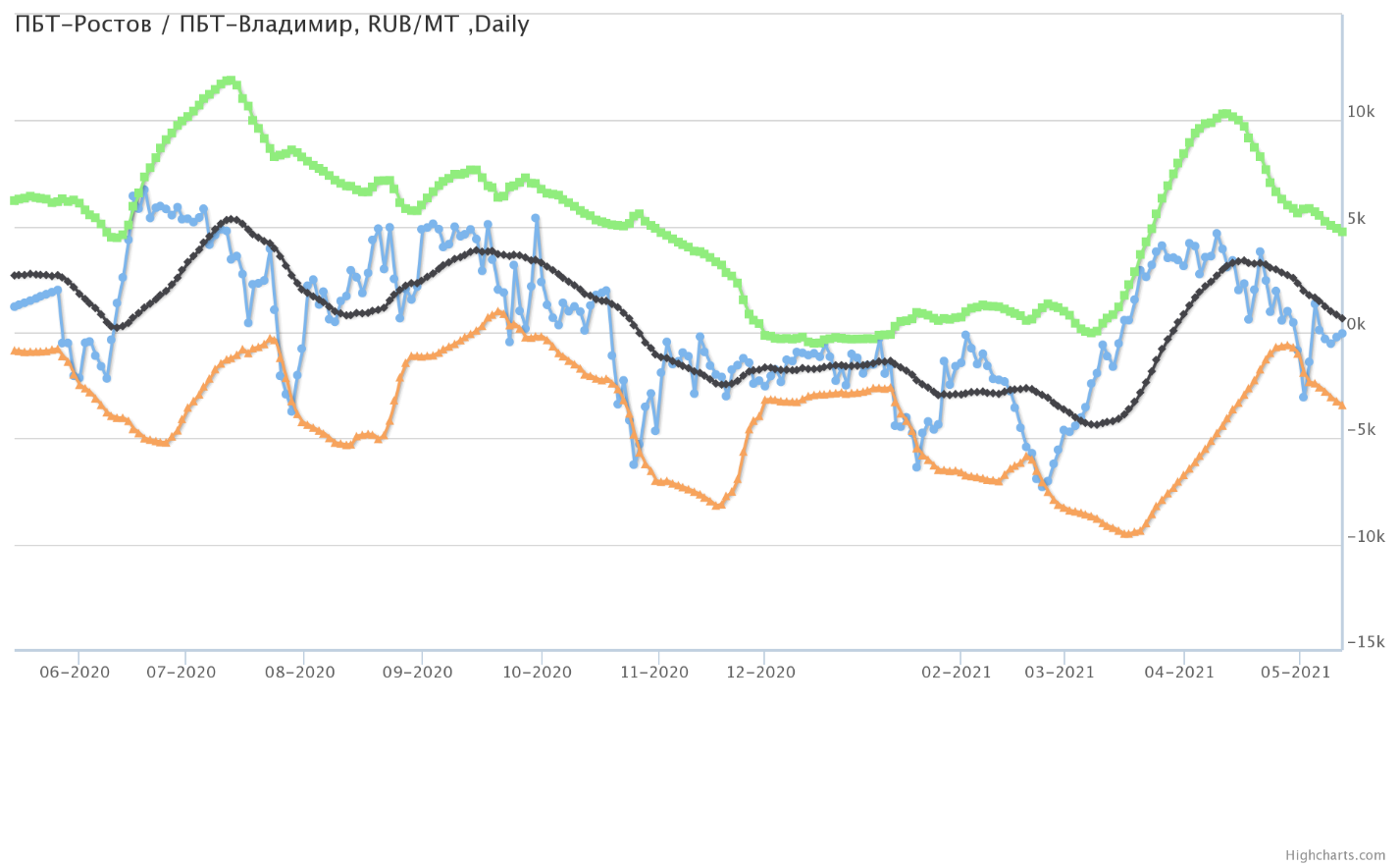 Разница цен между ПБТ на базисе Ростов и ПБТ на базисе Владимир.