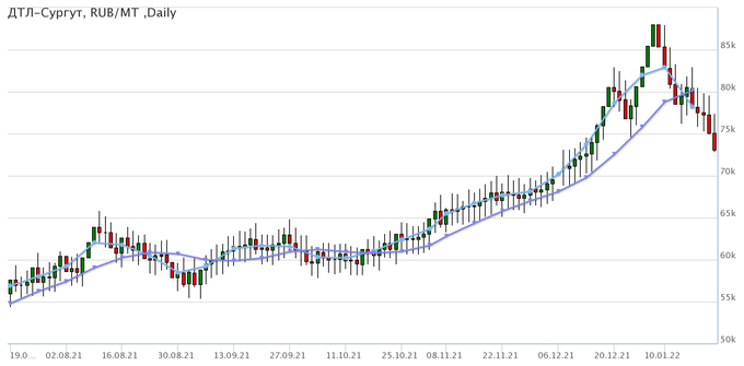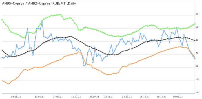 Разница цен между 95-м и 92-м бензином на базисе Сургут (Ханты-Мансийский а.о.).