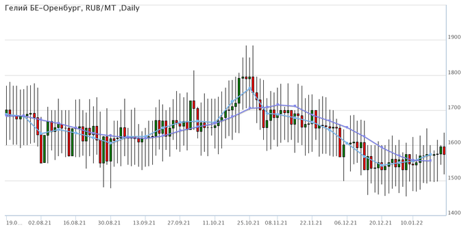 Цены на гелий газообразный, базис поставки Оренбургская область, не изменились за неделю, и составляют 1575 рублей за кубический метр.