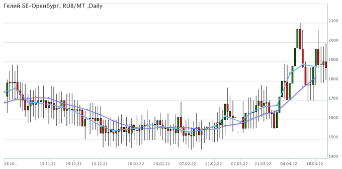 Цены на гелий газообразный, базис поставки Оренбургская область, снизились за неделю на 1 рубль до 1870 рублей за кубический метр.