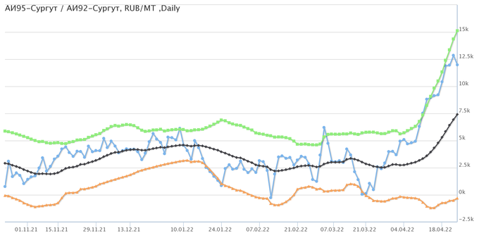 Разница цен между 95-м и 92-м бензином на базисе Сургут (Ханты-Мансийский а.о.).