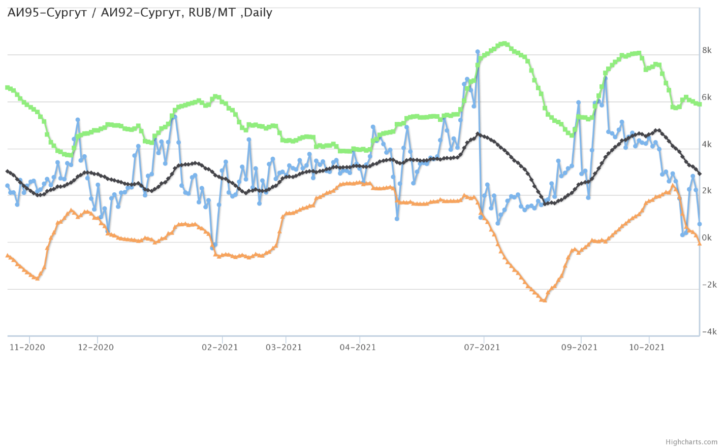 Разница цен между 95-м и 92-м бензином на базисе Сургут (Ханты-Мансийский а.о.).
