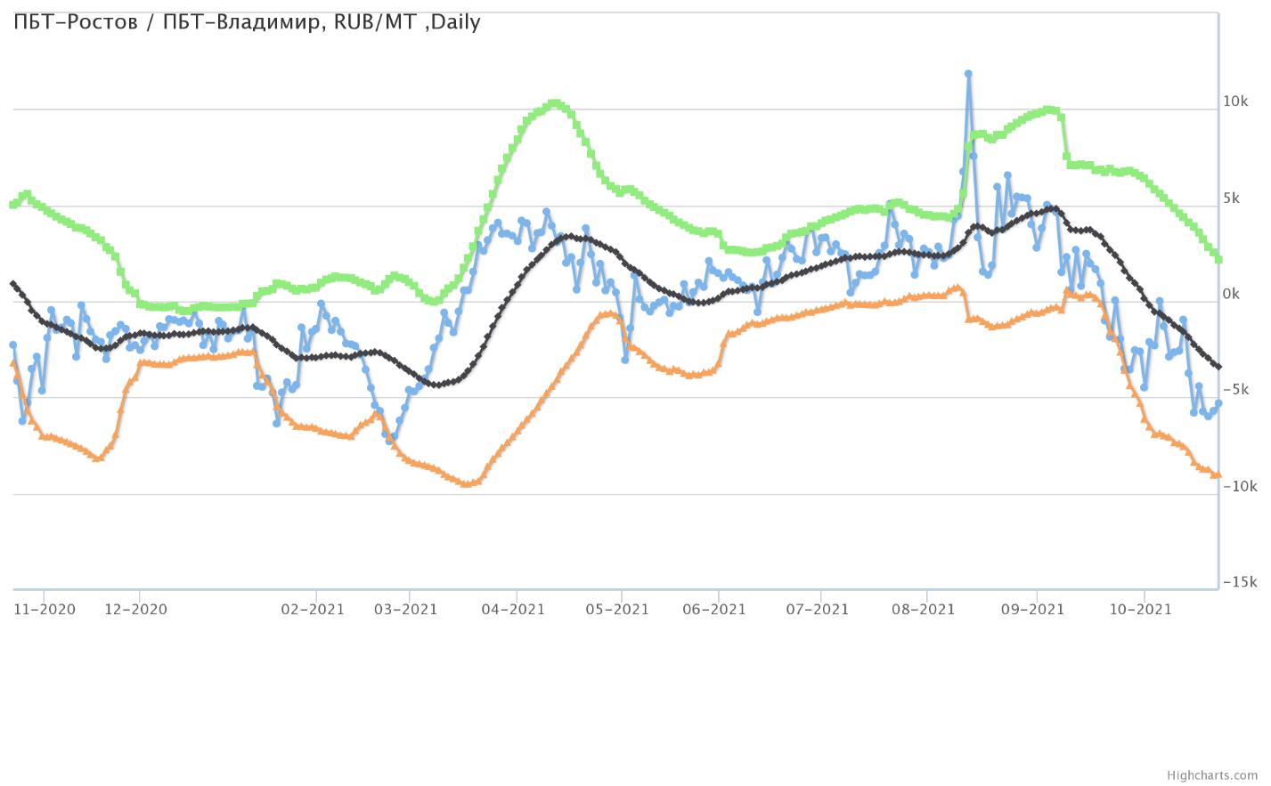 Разница цен между ПБТ на базисе Ростов и ПБТ на базисе Владимир.