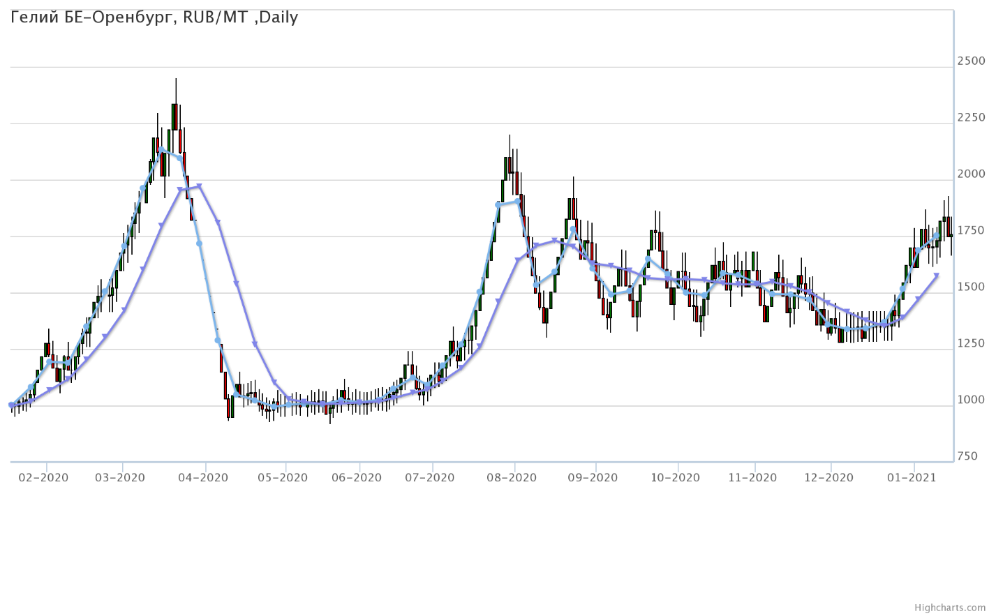 Цены на гелий газообразный, базис поставки Оренбургская область, выросли за неделю на 54 рубля до 1760 рублей за кубический метр.
