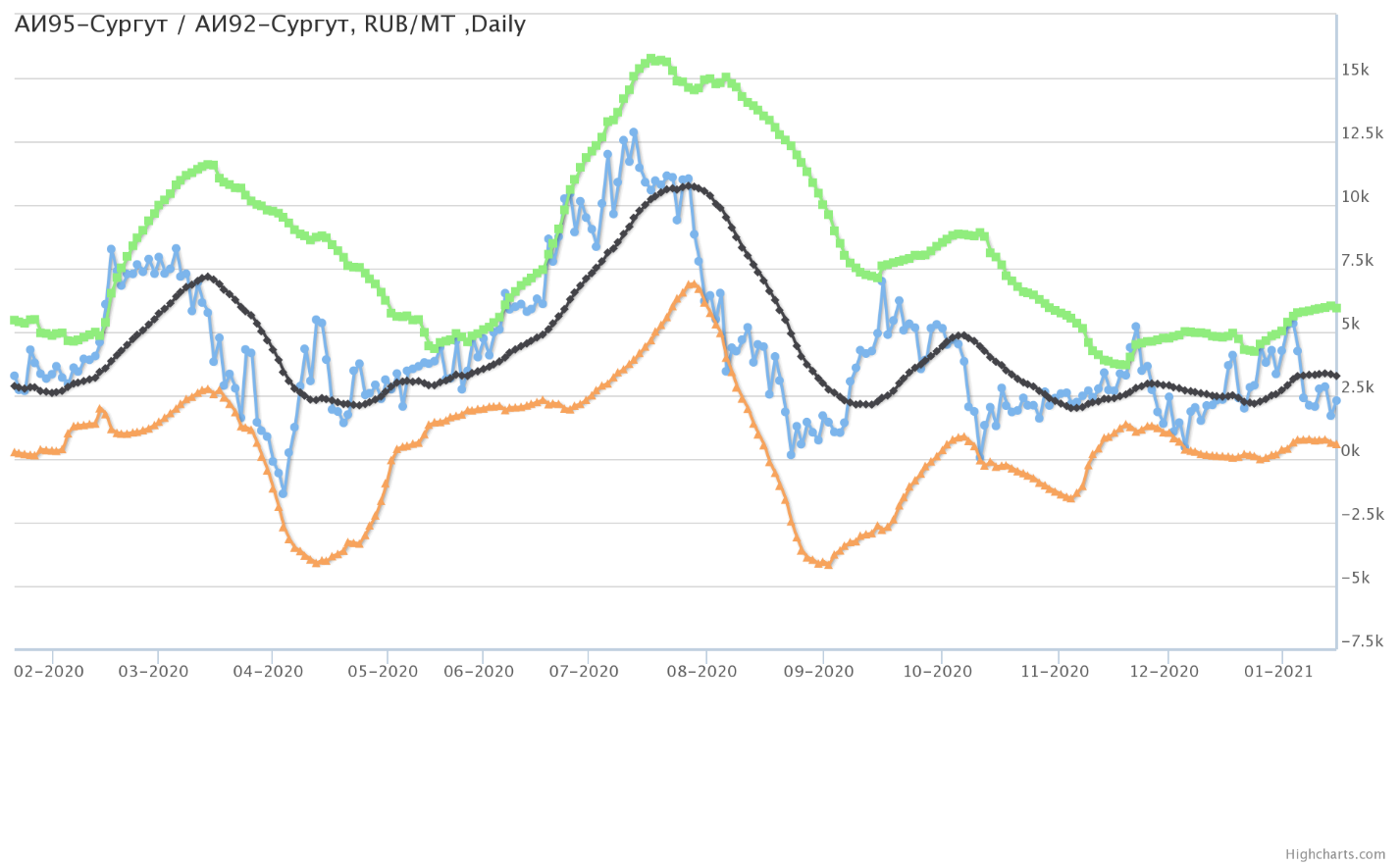 Разница цен между 95-м и 92-м бензином на базисе Сургут (Ханты-Мансийский а.о.).
