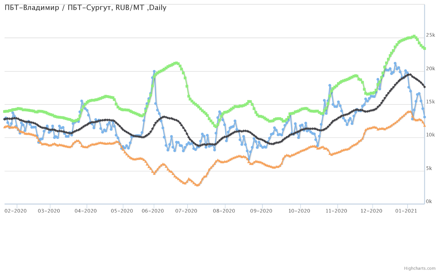 Разница цен между ПБТ на базисе Владимир и ПБТ на базисе Сургут (Ханты-Мансийский а.о.).