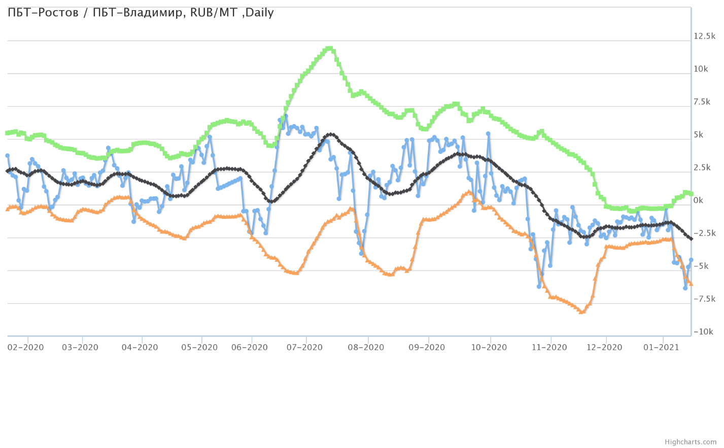Разница цен между ПБТ на базисе Ростов и ПБТ на базисе Владимир.