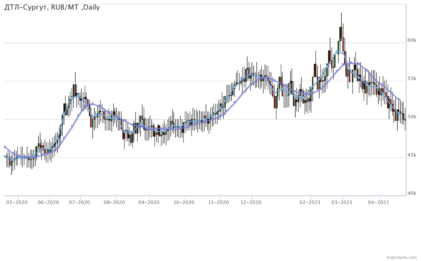 Цены на топливо дизельное ДТ-А-К5, базис поставки Ханты-Мансийский АО, снизились за неделю на 1354 рубля до 49900 рублей за тонну.