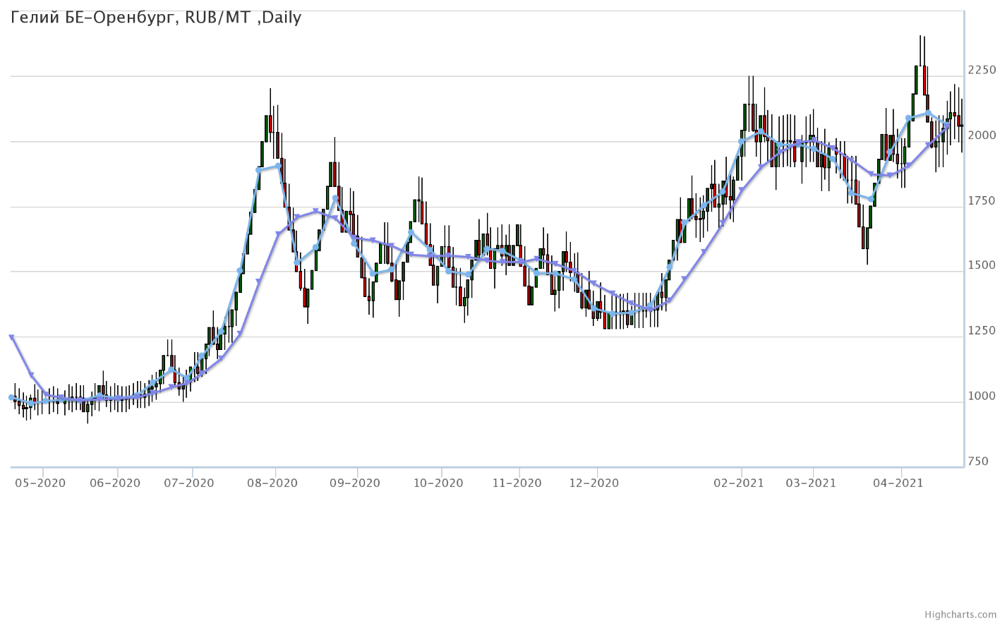 Цены на гелий газообразный, базис поставки Оренбургская область, выросли за неделю на 10 рублей до 2061 рубля за кубический метр.
