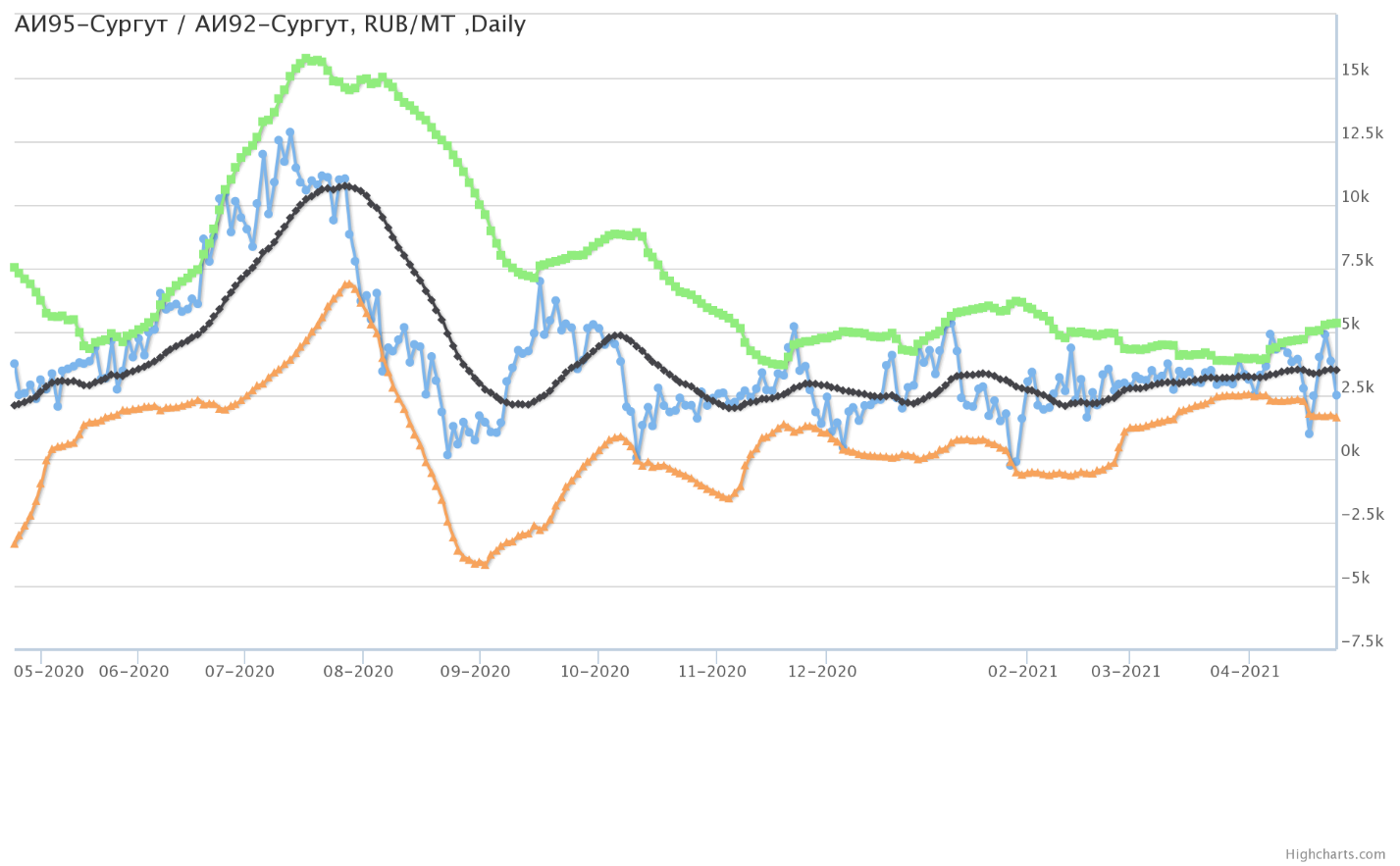 Разница цен между 95-м и 92-м бензином на базисе Сургут (Ханты-Мансийский а.о.).