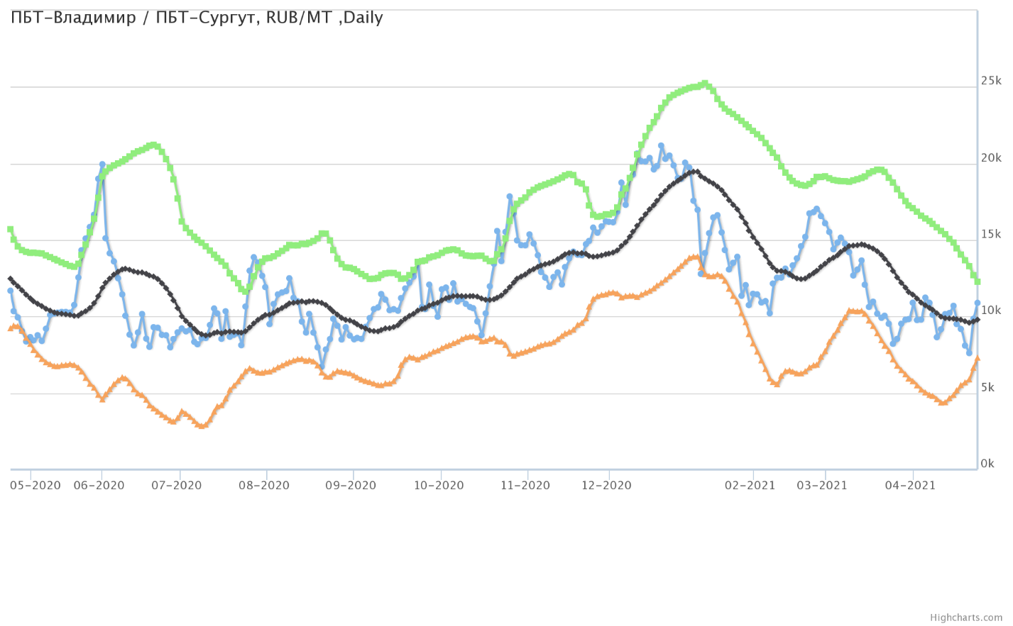 Разница цен между ПБТ на базисе Владимир и ПБТ на базисе Сургут (Ханты-Мансийский а.о.).