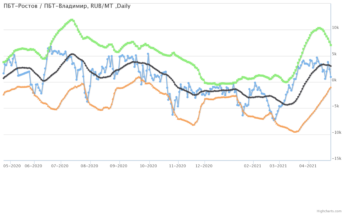 Разница цен между ПБТ на базисе Ростов и ПБТ на базисе Владимир.
