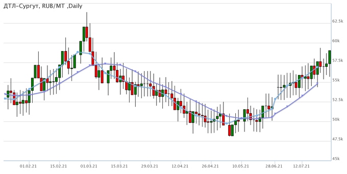 Цены на топливо дизельное ДТ-А-К5, базис поставки Ханты-Мансийский АО, выросли за неделю на 3050 рублей до 59050 рублей за тонну.