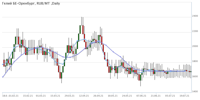 Цены на гелий газообразный, базис поставки Оренбургская область, не изменились за неделю, и составляют 1685 рублей за кубический метр.