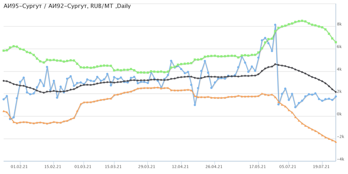 Разница цен между 95-м и 92-м бензином на базисе Сургут (Ханты-Мансийский а.о.).