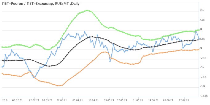 Разница цен между ПБТ на базисе Ростов и ПБТ на базисе Владимир.